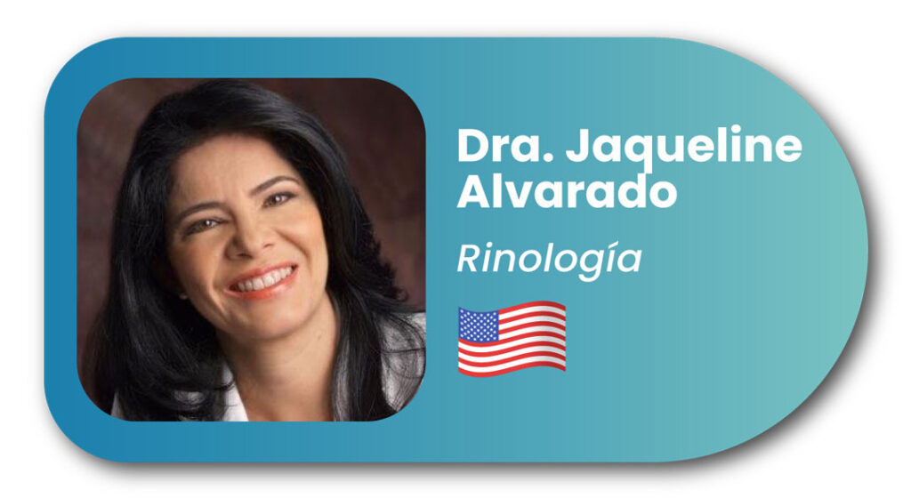 La Dra. Jaqueline Alvarado es especialista en Otorrinolaringología y Cirugía de Cabeza y Cuello, con participación activa en la comunidad académica y científica de la especialidad en América Latina. Ha colaborado en actividades científicas internacionales y en la difusión del conocimiento médico dentro del campo de la otorrinolaringología, participando en congresos y programas educativos enfocados en la actualización médica continua.